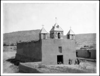 Keywords: Exterior view of a church at Cibolleta, New Mexico, ca.1898 (CHS-4557).jpg en <br> Exterior view of a church at Cibolleta New Mexico ca 1898 Photograph of an exterior view of a church at Cibolleta New Mexico ca 1898 The large rectangular building sports three wooden bell towers -- two smaller ones flanking a larger central one -- over the main entry overlooking the walled graveyard Each tower is topped with a cross Five people possibly one or two families stand in the graveyard near the open entry in which a few more people can be seen in the shadows Picket fences and crosses mark three graves in the foreground A few other smaller buildings can be seen behind and to the right A hill rises in the background Call number CHS-4557 Photographer James George Wharton Filename CHS-4557 Coverage date circa 1898 Part of collection California Historical Society Collection 1860-1960 Type images Geographic subject city or populated place Cibolleta; San Jose Repository name USC Libraries Special Collections Accession number 4557 Microfiche number 1-179- Archival file chs_Volume96/CHS-4557 tiff Part of subcollection Title Insurance and Trust and C C Pierce Photography Collection 1860-1960 Repository address Doheny Memorial Library Los Angeles CA 90089-0189 Geographic subject country USA Format aacr2 3 photographs transparency photoprints b w ; 20 x 25 cm 21 x 26 cm Rights Digitally reproduced by the USC Digital Library; From the California Historical Society Collection at the University of Southern California Subject adlf religious facilities Project USC Repository email specol usc edu Identifying number unidentified no James-1436 Contributing entity California Historical Society Date created circa 1898 Publisher of the digital version University of Southern California Libraries Format aat transparencies; photographic prints; photographs Geographic subject state New Mexico Legacy record ID chs-m16891; USC-1-1-1-13971 Access conditions Send requests to address or e-mail given Phone 213 821-2366; fax 213 740-2343 Subject file heading Indians -- Pueblo -- Pueblo villages New Mexico Subject lcsh Indians of North America Subject Pueblo Indians; Pueblos of New Mexico circa 1898 date created George Wharton James 1858 1923 http //digitallibrary usc edu/cdm/ref/collection/p15799coll65/id/16813 PD-old-70-1923 Images from USC Digital Library uploaded by Fæ Photographs by George Wharton James California Historical Society Collection 1860-1960
