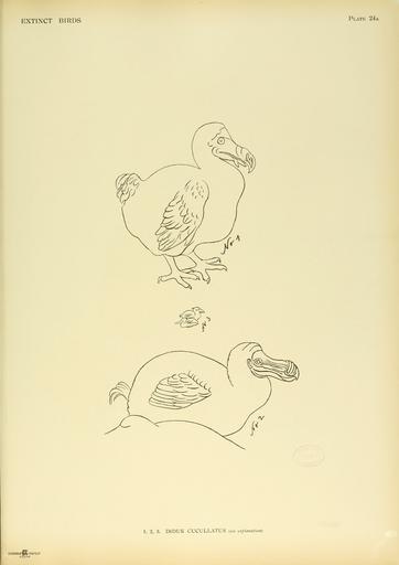 | Keywords: Extinctbirds1907 P24A Didus cucullatus0331.png en The dodo Raphus cucullatus was a flightless bird endemic to the Indian Ocean island of Mauritius Fig 1 Reproduction in outline of the Dodo in Savery's Orpheus at Haag Vide antea No 7 in the List of Paintings Fig 2 Outline of Dodo and Pelican in Ruthart's Circe and Ulysses at Dresden Vide antea No 13 in the List of Paintings Fig 3 Outline of Dodo and Pelican J in Frans Franckens picture in Dresden Vide antea No 14 in the List of Paintings Extinct birds an attempt to unite in one volume a short account of those birds which have become extinct in historical times that is within the last six or seven hundred years to which are added a few which still exist but are on the verge of extinction By Lionel Walter Rothschild 2nd Baron Rothschild 8 February 1868 “ 27 August 1937 http //www archive org/details/extinctbirdsatte00roth Unknown Book Lionel Walter Rothschild 1907 Not in copyright Public Domain Original PD-old Extinct Birds Rothschild book 24a Raphus cucullatus in art |