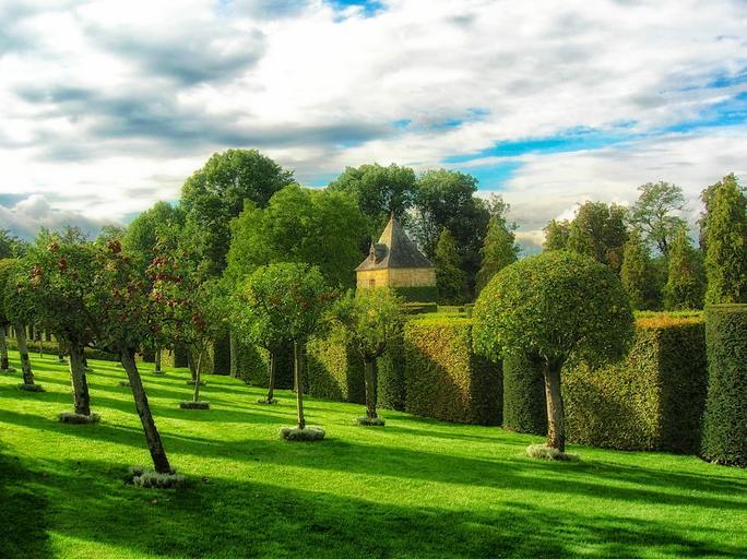 Keywords: eyrignac manor gardens dordogne france summer spring trees plants foliage flowers nature outside sky clouds destinations landmark hdr