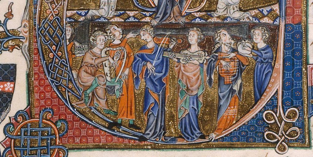 MAKE A MEME View Large Image F107v b.png en Image from the Gorleston Psalter with medieval musicians A variety of instruments are pictured from the left unknown harp singer rebec citole psaltery tambourine or drum Estimated date of creation ranges from 1310-1324 ...