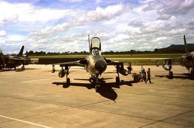 | Keywords: F-105D.jpg U S Air Force Republic F-105D Thunderchief fighters of the 355th Tactical Fighter Wing at Takhli Royal Thai Air Force Base in 1966 <br> The photo was taken in 1966 at Takhli Nakhon Sawan Province Thailand 15 16' 40 08 N; 100 17' 44 49 E a wartime operating base from which routine morning and then afternoon strikes on Hanoi were launched consisting of perhaps 48 fighters supported by Boeing KC-135A tankers and Douglas RB-66C stand-off jammers The elevation of the camera suggests that I was in the EWO seat of an Wild Weasel F-105F taxing out for an afternoon mission Note the relative size of the fighter vs the crew-chief walking away The pictured D is loaded in the typical manner with two 450 gal fuel tanks and five one-thousand-pound low drag bombs The load and route distance is similar to that of B-17s London to Berlin The defenses around Hanoi were also similar to Berlin http //en wikipedia org/wiki/Image F-105D jpg 1966 Spoongap en Wikipedia Spoongap Republic F-105D Thunderchief USAF mission at Takhli RTAFB during the Vietnam War 355th Fighter Wing United States Air Force |