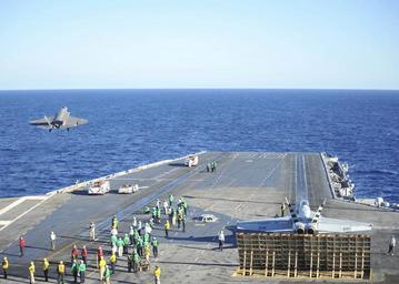 Keywords: F-35C Lightning II conducts 1st carrier launch 141104-N-UV347-108.jpg en An F-35C Lightning II carrier variant joint strike fighter performs a touch-and-go over the flight deck of the aircraft carrier USS Nimitz The F-35 Lightning II Pax River Integrated Test Force from Air Test and Evaluation Squadron 23 is conducting initial at-sea trials aboard Nimitz 2014-11-04 CVN 68 https //www dvidshub net/image/1645263 141104-N-UV347-108 2014-11-05 21 05 USS NIMITZ AT SEA PD-USGov-Military-Navy F-35C Lightning II aircraft carrier launches USS Nimitz CVN-68 Images from DoD uploaded by Fæ |