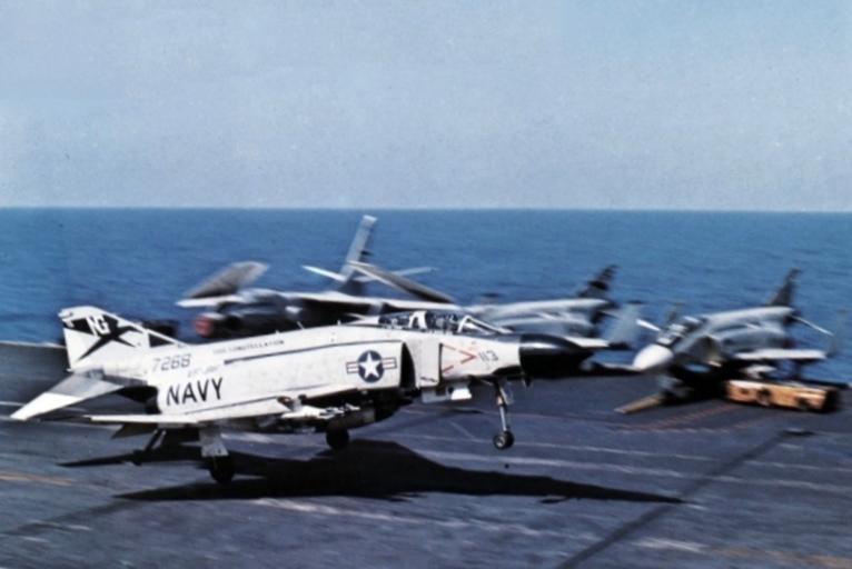 | Keywords: F-4J VF-96 landing on USS Constellation (CVA-64) c1972.jpg A U S Navy McDonnell F-4J-41-MC Phantom II BuNo 157268 from Fighter Squadron VF-96 Fighting Falcons landing aboard the aircraft carrier USS Constellation CVA-64 VF-96 was assigned to Carrier Air Wing 9 CVW-9 aboard Constellation for a deployment to Vietnam from 1 October 1971 to 1 July 1972 Official U S Navy photograph http //navysite de/cruisebooks/cv64-71/121 htm from the USS Constellation CVA-64 http //navysite de/cruisebooks/cv64-71/index_018 htm 1971-72 Cruise Book ca 1972 USN PD-USGov-Military-Navy F-4J Phantom II Fighter Squadron 96 United States Navy USS Constellation CV-64 flight deck |