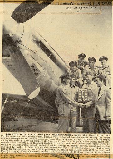| Keywords: tbt throwbackthursday usaf airmen airforce Airmen with the 169th Fighter Squadron's Flight B receive a trophy on Aug. 26, 1951, for earning the highest score in air-to-air gunnery during annual training. Airmen with the 169th Fighter Squadron's Flight B receive a trophy on Aug. 26, 1951, for earning the highest score in air-to-air gunnery during annual training. |