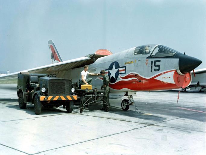 Keywords: F-8 Crusader of VMF-334 on the ground.jpeg A U S Marine Corps Vought F-8C Crusader from Marine Fighter Squadron 334 VMF-334 Falcons http //collections naval aviation museum/emuwebdoncoms/pages/doncoms/AdvQuery php U S Navy National Museum of Naval Aviation photo No http //collections naval aviation museum/emuwebdoncoms/pages/doncoms/Display php irn 46624 QueryPage 2Femuwebdoncoms 2Fpages 2Fdoncoms 2FAdvQuery php 1996 253 7357 032 s 1960 U S Navy PD-USGov-Military-Navy F-8C Crusader Marine Fighter Attack Squadron 334