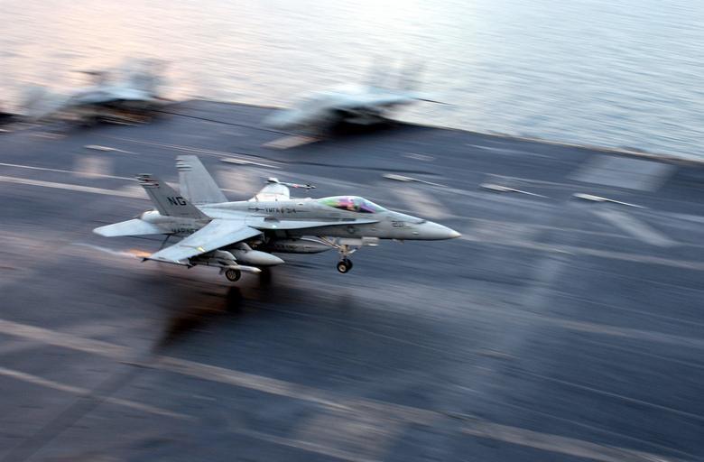 Keywords: FA-18-Appontage.jpg At sea aboard USS John C Stennis CVN 74 - An F/A-18 Hornet from the Black Knights of Marine Fighter Attack Squadron Three One Four VMFA-314 makes an arrested landing on the flight deck http //www navy mil/view_image asp id 841 2002-02-21 U S Navy photo by Photographer's Mate Airman Michael Arteaga PD-USGov-Military-Navy USS John C Stennis CVN-74 flight deck Marine Fighter Attack Squadron 314 Panning of aircraft F/A-18 Hornet aircraft carrier landings F/A-18C Hornet on flight decks |