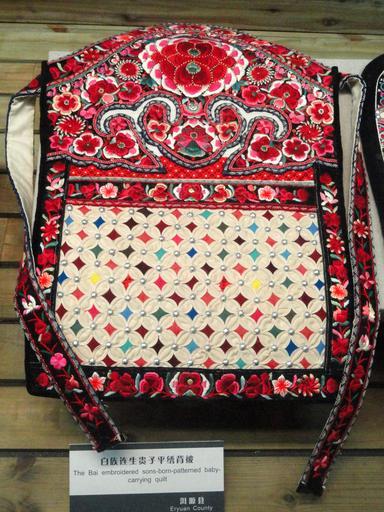 | Keywords: Fabric - Yunnan Nationalities Museum - DSC04141.JPG Bai embroidered baby-carrying quilt Fabric exhibited in the Yunnan Nationalities Museum Kunming Yunnan China I took this photograph 2011-08-13 01 51 28 Daderot Public domain Fabric in the Yunnan Nationalities Museum Bai clothing |