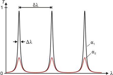 Keywords: Fabry Perot Resonances.svg Fabry Perot Resonances created with Gnuplot and Corel Draw 2005-03-10 Ansgar Hellwig parameters <br/> 80 mirror reflectivity<br/> 5 mm length<br/> α<sub>1</sub> 0 05 dB/cm and α<sub>2</sub> 0 2 dB/cm<br/> λ ‰ˆ1550 nm Fabry-Pérot interferometer |