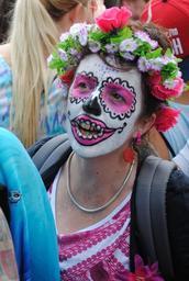 Keywords: face painted street parade zurich portrait white floral wreath clown panel woman