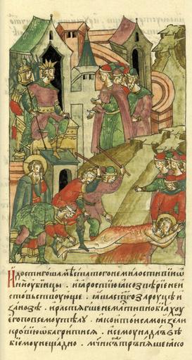 Keywords: Facial Chronicle - b.06, p.157 - Death of Michael of Chernigov.jpg И п ишли к месту этому беспощадные те убийцы я остные как зве и и неистовые; взяли святого за уки и за ноги и астянув беспощадно били его по всему телу так что и сама земля там от к ови стала к асной И его долго избивали без милости мученик же те пел как будто http //www akteon-elib ru/LITsIeVOI-LIeTOPISNYI-SVOD-Russkaya-letopisnaya-istoriya-Kniga-6/ 38 century 16 anonymous PD-Old Files uploaded by Shakko from various sources Mikhail of Chernigov in miniature Facial Chronicle v 5 - Laptevskiy tom 1116-1252 1246 in Russia Death in medieval miniatures Russia |