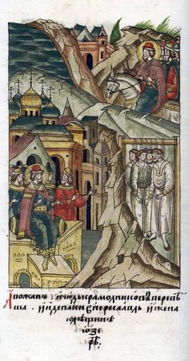 Keywords: Facial Chronicle - b.06, p.068 - Execution of vod and chud.jpg И вышел князь Александ вско е с новго одцами и с ладожанами и с ка елами и с ижо цами к го оду немецкому Копо ье И аз ушил князь Александ го од до основания; а самих немцев убил А некото ых немцев князь Александ с собой п ивел в овго од а д угих отпустил в их землю немецкую ибо был Александ милостив све х ме ы А мятежников из племен води и чуди Александ пе евешал и пошел затем в Пе еславль что на Клещине озе е иниатю а из Лицевого летописного свода 16 век author PD-art Archaeological sites in Russia Defunct towns in Russia Castles in Russia History of Pereslavl-Zalessky Alexander Nevsky in miniature Facial Chronicle v 5 - Laptevskiy tom 1116-1252 Death in medieval miniatures Russia Files uploaded by Shakko from various sources