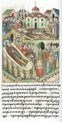 | Keywords: Facial Chronicle - b.07, p.062 - Death of Fedor the Black.jpg ЛИЦЕВОЙ ЛЕТОПИС ЫЙ СВОД В том же году пост игся в святой ангельский иноческий об аз князь великий Феодо Че ный Я ославский сын великого князя Ростислава Смоленского внук стиславов п авнук Давыдов п ап авнук Ростиславов п еп авнук стиславов потомок п ащу а Владими а анамаха п ап ащу а Я ослава п еп ащу а великого Владими а и п еставился в святом ангельском и иноческом об азе и в схиме и положен был в це кви святого Спаса в Я ославле От него же тогда многие чудеса были и ныне многие све шаются чудеса и исцеление бесчисленное всем п иходяшим с ве ою http //www akteon-elib ru/LITsIeVOI-LIeTOPISNYI-SVOD-Russkaya-letopisnaya-istoriya-Kniga-7/ 2 century 16 anonymous PD-Old Facial Chronicle v 6 - Ostermanovskiy 1-y tom 1254-1378 Death in medieval miniatures Russia Files uploaded by Shakko from various sources 1299 in Russia Theodore Rostislavich the Black |