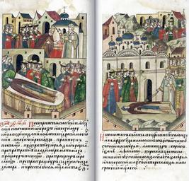 | Keywords: Facial Chronicle - b.07, p.092-093 - Death of Danila of Moscow.jpg ЛИЦЕВОЙ ЛЕТОПИС ЫЙ СВОД В 6811 году Пост игся в святой ангельский и иноческий об аз и в схиму князь великий Данило Александ ович осковский внук Я ославов п авнук Всеволодов п ап авнук Ю ия Долго укого п еп ап авнук Владими а анамаха потомок п ащу а Всеволода п ап ащу а Я ослава п еп ап ащу а великого Владими а и п еставился месяца ма та в 4-й день И положен был в це кви святого ихаила А хангела на оскве в своей отчине Его сыновья Ю ий Александ Бо ис Иван Афанасий Пе еславцы же после сме ти его встали за сына его за Ю ия и не пустили его из Пе еславля на пог ебение отца его http //www akteon-elib ru/LITsIeVOI-LIeTOPISNYI-SVOD-Russkaya-letopisnaya-istoriya-Kniga-7/ 2 century 16 anonymous PD-Old Facial Chronicle v 6 - Ostermanovskiy 1-y tom 1254-1378 Death in medieval miniatures Russia Files uploaded by Shakko from various sources 1303 in Russia Daniel of Moscow in miniature |