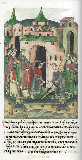 | Keywords: Facial Chronicle - b.07, p.118 - Murder of Konstantin Romanovich of Ryazan.jpg ЛИЦЕВОЙ ЛЕТОПИС ЫЙ СВОД В том же году в Филиппово говение князь великий Ю ий Данилович повелел у себя на оскве великого князя язанского Константина Романовича убить кото ого захватил хит остью некоею на бою отец его князь великий Данило Александ ович внук Я ославлов http //www akteon-elib ru/LITsIeVOI-LIeTOPISNYI-SVOD-Russkaya-letopisnaya-istoriya-Kniga-7/ 2 century 16 anonymous PD-Old Facial Chronicle v 6 - Ostermanovskiy 1-y tom 1254-1378 Death in medieval miniatures Russia Files uploaded by Shakko from various sources 1306 in Russia Princes of Ryazan Yuri of Moscow in miniature |