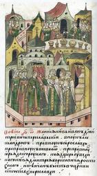 Keywords: Facial Chronicle - b.07, p.012 - Wedding of Ivan Dmitrievich of Pereyaslavl.jpg ЛИЦЕВОЙ ЛЕТОПИС ЫЙ СВОД В 6800 году Женился князь Иван Дмит иевич Пе еславский внук Александ ов п авнук Я ославов п ап авнук Всеволодов п еп авнук Ю ия Долго укого взял дочь у великого князя Дмит ия Бо исовича Ростовского и венчан был в це кви святого Спаса в Пе еславле http //www akteon-elib ru/LITsIeVOI-LIeTOPISNYI-SVOD-Russkaya-letopisnaya-istoriya-Kniga-7/ 2 century 16 anonymous PD-Old Facial Chronicle v 6 - Ostermanovskiy 1-y tom 1254-1378 Files uploaded by Shakko from various sources Ivan Dmitrievich of Pereyaslavl Weddings in medieval manuscripts Russia 1292 in Russia Rurik Dynasty