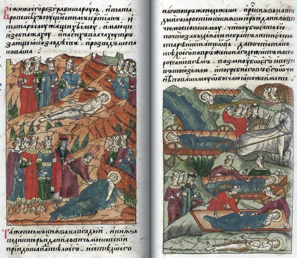 View Original:Facial_Chronicle_-_b.07,_p.204-205_-_The_body_of_Mikhail_of_Tver.jpg (924x804)