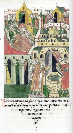 View Original:Facial_Chronicle_-_b.08,_p.076_-_Birth_of_Mikhail_Simeonovich_of_Moscow.jpg (447x813)