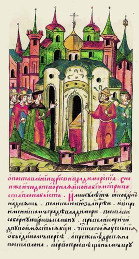 Keywords: Facial Chronicle - b.11, p.198 - Andrey Bogolubskiy builds church.gif О пост оении це кви Владими ской в ко- то ой была помешена икона Богомате и П ошло одиннадцать лет Великий князь Анд ей в знаменитом г аде Владими е по- ставил чудную боль- шую каменную собо - ную це ковь во имя честного Успения свя- той Бого одицы с од- ним ве хом А п ежде там была де евянная це ковь поставленная пе вым п инявшим п авославие 199 Великий князь Анд ей той со- бо ной це кви дал много имений и слободы купил для них с данями и луч- шими селами и дал десятую часть от стад своих и то г десятый и ве х её позолотил усским самоде жцем великим князем Вла- дими ом http //www runivers ru/bookreader/book480116/ page/129/mode/1up century 16 anonymous PD-Old Files uploaded by Shakko from various sources Facial Chronicle v 7 - Ostermanovskiy 2-y tom 1378-1424 Andrei Bogolyubsky in miniature Cathedral of the Dormition of the Theotokos Vladimir
