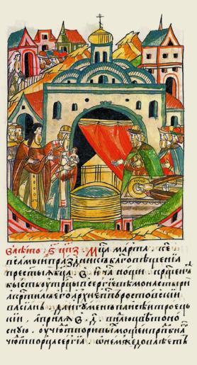 Keywords: Facial Chronicle - b.16, p. 360 - Baptism of Vasily III.gif в 6987 году месяца ма та в 25 день в са- мый п аздник Благо- вещения П есвятой Бого одицы в вось- мом часу ночи К е- щен же был у Т оицы в Се гиеве монасты е а к естил его а хи- епископ Ростовский Вассиан да игумен Т оицкий Паисий ап еля в 4 день в не- делю Цветоносную у чудотво ных мощей п еподобного чудот- во ца Се гия о чем следует http //www runivers ru/bookreader/book481263/ page/5/mode/1up 16th-century anonymous PD-Old Facial Chronicle v 8 - Shumilovskiy tom 1425; 1478-1533 Files uploaded by Shakko from various sources 1479 in Russia Vasily III of Russia in miniature |