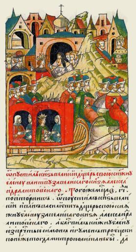 Keywords: Facial Chronicle - b.17, p. 282 - Elena Ivanovna leaving Moscow.gif Отпустил великий князь свою дочь княж- ну Елену в Литву за великого князя Алек- санд а Литовского В том же месяце в 13 день во вто ник отпустил великий князь Иван Василье- вич свою дочь княжну Елену за великого князя Александ а Литовского а благо- словил княжну Елену игумен Т оицкий Си- мон потому что тогда мит ополита не было; и послал с ней своих послов вместе с же- нами князя Семена Ивановича Ряполов- ского ихаила Яков- левича Русалку и дьяка Василия Кулешина и многих д угих кня- зей и боя ских детей своего дво а http //sterligoff ru/books/Rus_Kniga 2018 pdf 16th-century anonymous PD-Old Facial Chronicle v 8 - Shumilovskiy tom 1425; 1478-1533 Files uploaded by Shakko from various sources Helen of Moscow 1495 in Russia |