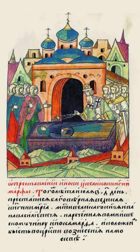 | Keywords: Facial Chronicle - b.17, p. 033 - Death of Maria Yaroslavna.gif О кончине инокини и великой княгини а фы В то же лето июля в 4 день сконча- лась благове ная ве- ликая княгиня а ия мать великого князя Ивана Васильевича на ечена она была в монашеском чине инокиня а фа и по- ложена была в це кви Вознесения в оскве http //www runivers ru/bookreader/book481263/ page/5/mode/1up 16th-century anonymous PD-Old Facial Chronicle v 8 - Shumilovskiy tom 1425; 1478-1533 Death in medieval miniatures Russia Files uploaded by Shakko from various sources 1484 in Russia Maria Yaroslavna of Borovsk in miniature |