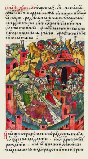 Keywords: Facial Chronicle - b.19, p. 033 - Birth of Ivan IV.gif И в 7038 году месяца августа в 25 день на память святых апо- столов Ва фоломея и Тита в седьмой час ночи одился у вели- кого князя Василия Ивановича сын от ве- ликой княгини Елены Глинской кото ому на ечено было бла- годатное имя Иван в честь Иоанна П ед- течи И была в го оде оскве а- дость большая о ождении сына у го- суда я а также и по всей земле воз адо- вались люди адостью неиз еченной http //www runivers ru/bookreader/book481461/ page/31/mode/1up 16th-century anonymous PD-Old Facial Chronicle v 8 - Shumilovskiy tom 1425; 1478-1533 Files uploaded by Shakko from various sources Elena Glinskaya Vasily III of Russia in miniature Ivan IV of Russia in manuscripts 1530 in Russia