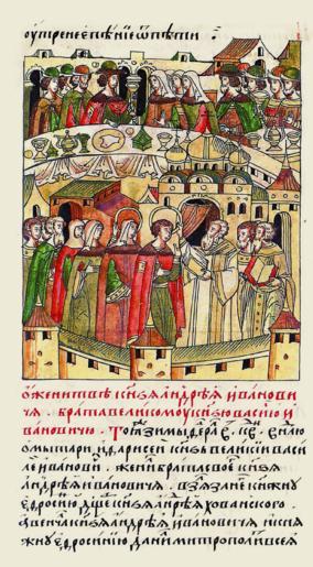 Keywords: Facial Chronicle - b.19, p. 163 - Andrey of Staritsa's wedding.gif О женитьбе князя Ан- д ея Ивановича б ата великого князя Васи- лия Ивановича Той же зимой в фев але в 22 день в воск есе- нье о ыта е и Фа- исее великий князь Василий Иванович же- нил б ата своего кня- зя Анд ея Ивановича взял за него княжну Еф осинью дочь князя Анд ея Хованского; а венчал князя Анд ея Ивановича и княжну Еф осинью Даниил мит ополит всея Руси в собо ной це к- ви славного ца ствую- щего го ода осквы http //www runivers ru/bookreader/book481461/ page/31/mode/1up 16th-century anonymous PD-Old Facial Chronicle v 8 - Shumilovskiy tom 1425; 1478-1533 Files uploaded by Shakko from various sources 1533 in Russia Euphrosyne of Staritsk Andrey Ivanovich of Staritsa in miniature Daniil Metropolitan of Moscow Weddings in medieval manuscripts Russia |