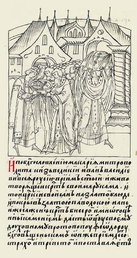 | Keywords: Facial Chronicle - b.20, p. 273 - Coronation Ivan IV-(2).jpg Coronationscene Ivan IV / Krönungsszene von Iwan IV И по благослове- нию мит опо- лита ака ия великий князь Иван Васильевич всея Руси взял своими уками святой и животво я- щий к ест и свой ца - ский тот сан на золо- том блюде и пок ыв золотою паволокою с к естом усаженным бисе ом и многоцен- ными камнями подал своему духовному отцу п отопопу Бла- говещенскому Федо- у; тот же взял блюдо со ст ахом и т епетом и вод узил Book of the Tsar / Buch der Zaren century 16 author PD-Art PD-Art Facial Chronicle v 10 - Tsarstvennaya kniga 1533-1553 Ivan IV's coronation |