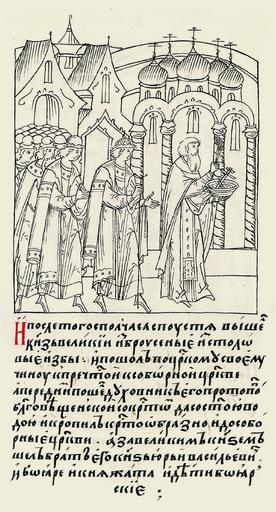 Keywords: Facial Chronicle - b.20, p. 275 - Coronation Ivan IV (3).jpg Coronationscene Ivan IV / Krönungsszene von Iwan IV И после того спустя полчаса вышел великий князь из Столовой б усяной избы и по- шел по ца скому своему чину к Успен- ской собо ной це кви; а пе ед ними шел его духовник Благовещен- ский п отопоп с к е- стом и святой водой и к опил к естоо- б азно до собо ной це кви; а за великим князем шел его б ат князь Ю ий Василье- вич и боя е и княжа- та и боя ские дети Book of the Tsar / Buch der Zaren century 16 author PD-Art PD-Art Facial Chronicle v 10 - Tsarstvennaya kniga 1533-1553 Ivan IV's coronation Yuri of Uglich 1532-1563 in miniature |