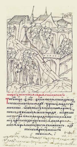 | Keywords: Facial Chronicle - b.20, p. 317.gif иниатю а из Ца ственной книги осква 1550 1560-е гг Об убийстве князя Ю ия Глинского /В том же месяце в 26 день в воск есе- нье на пятый день после великого по- жа а п остолюдины го ода осквы от великой ско би из-за пожа а взбунто- вались словно безумные п ишли в г ад и на площади забили камнями ца ева великого князя боя ина князя Ю ия Васильевича Глинского и детей боя ских многих побили/ И после пожа а на 2 день п иехал ца ь и великий князь навещать ми- т ополита ака ия в овое и с ним были боя е и в ажьим наветом начали гово ить что волшебством человече- ские се дца вынимали и в воде мочи- ли и той водою к опили и оттого вся осква пого ела ачали же эти слова п оизносить духовник ца я и великого князя п отопоп Благовещенский Федо и боя ин князь Федо Скопин-Шуй- ский и Иван Пет ов Федо ов И ца ь и великий князь велел боя ам п оизве- сти озыск Боя е п иехали к собо ной це кви Успения Бого одицы на пло- щадь и соб али че ных людей и начали воп ошать кто поджег оскву Они же начали гово ить что княгиня Анна Глинская со своими детьми и людьми волхвовала вынимала человеческие се дца и клала в воду и с той водой ездила по оскве и к опила и оттого осква выго ела И гово или че ные люди что в ту по у Глинские у госуда я находятся в п иближении и жаловании а от их людей че ным людям тво ится насилие и г абеж они же от того не унимались А князь ихаил Глинский находился тогда с мате ью на госуда - ском жаловании в Ржеве; и князь Ю ий Глинский тогда п иехал и как услышал такие ечи о мате и и о себе пошел в це ковь П ечистой Бого одицы Бо- я е же по своей неп иязни к Глинским нат авили че нь на него; те же схва- тили князя Ю ия в це кви и убили его в це кви выволокли пе едними две я- ми на площадь и за го од и положили пе ед тем колом на кото ом казнят Были же на совете http //www runivers ru/bookreader/book481478/ page/282/mode/1up 1550 1560 anonymous PD-Art Files uploaded by Shakko from various sources Facial Chronicle v 10 - Tsarstvennaya kniga 1533-1553 House of Glinskiy 1547 in Russia |