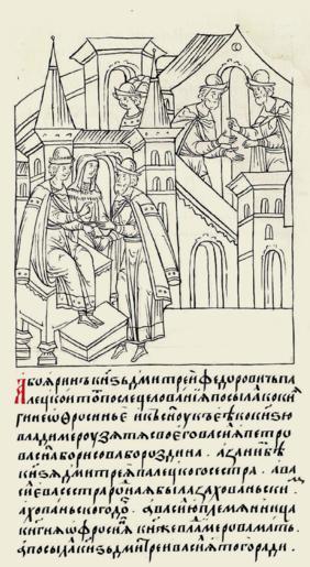 | Keywords: Facial Chronicle - b.21, p. 565.gif иниатю а Лицевого летописного свода XVI в А боя ин князь Дмит ий Федо- ович Палец- кий после целования посылал к княгине Еф осинье и к сыну ее князю Владими у зятя своего Василия Пет ова сына Бо и- сова Бо оздина; за ним замужем была сест а князя Дмит ия Палецкого а Василье- ва сест а одная была замужем за князем Хованским и дочь Хованского а Василию племянница княгиня Еф осиния мать князя Владими а А посылал князь Дмит ий Васи- лия вот для чего так как судом Бо- жьим а госуда ским ца я и великого князя п оизволением взял б ат ца я и велико- го князя князь Ю ий Васильевич дочь князя Дмит ия Палецкого вот князь Дмит ий Палецкий и посылал Василия к княгине Еф осинье и сыну ее князю Владими у чтобы княгиня и сын ее пожаловали князю Ю ию Василиевичу и доче и его князя Ю ия княгине дали удел по духовной г а- моте великого князя а они им княгине Еф осинье и князю Владими у будут на ца ство не соп о- тивны и служить им готовы » http //www runivers ru/bookreader/book482205/ page/43/mode/1up century 16 anonimus Facial Chronicle v 10 - Tsarstvennaya kniga 1533-1553 PD-Art 1552 in Russia Vladimir Andreevich of Staritsa in miniature Euphrosyne of Staritsk |
