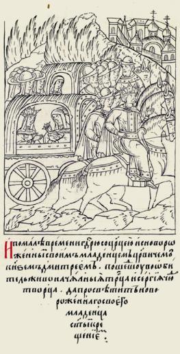 Keywords: Facial Chronicle - b.21, p. 536.gif иниатю а Лицевого летописного свода XVI в И вско е госу- да ь с ца ицей и ново ожден- ным своим младенцем ца евичем князем Дмит ием пошли в обитель живоначаль- ной Т оицы и Се гия чудотво ца чтобы п осветить ново ож- денного своего мла- денца святым к еще- нием http //www runivers ru/bookreader/book482205/ page/43/mode/1up century 16 anonimus Facial Chronicle v 10 - Tsarstvennaya kniga 1533-1553 PD-Art Anastasia Romanovna 1552 in Russia Dmitriy Ivanovich 1552-1553