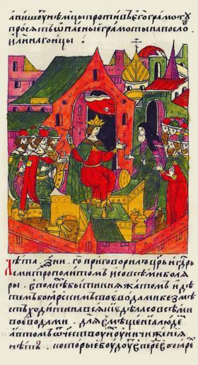Keywords: Facial Chronicle - b.22, p. 285.gif В 7058 1558 постановил ца ь госуда ь с мит ополитом и со всеми боя ами в полках быть княжатам и детям боя ским с воеводами без мест ходить на всякие дела без тесноты людям а в том отчеству их уничижения нет; кото ые будут вп едь в боя ах или воеводах и он считается по своему отчеству http //www runivers ru/bookreader/book482205/ page/17/mode/1up century 16 anonimus Facial Chronicle v 9 - Sinodalniy tom 1533-1542; 1553-1567 Files uploaded by Shakko from various sources PD-Art Macarius of Moscow 1558 in Russia |