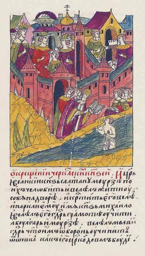 Keywords: Facial Chronicle - b.23, p. 100.jpg О к ещении че касских князей И ца ь и великий князь согласно их челобитью велел Салтан-му зе жить у себя на дво е и велел его к естить и назвали его князем ихаилом и велел госуда ь учить его г амоте; а Булга -му зе велел сказать госуда ь что уст оит им обо ону от Шевкал как только будет возможность http //www runivers ru/bookreader/book482205/ page/17/mode/1up century 16 anonimus Facial Chronicle v 9 - Sinodalniy tom 1533-1542; 1553-1567 Files uploaded by Shakko from various sources PD-Art House of Cherkasskiy 1558 in Russia Baptism in art