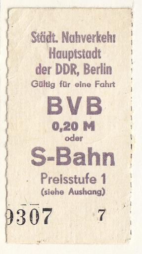 Keywords: Fahrkarte BVB S-Bahn DDR.jpg en Ticket BVB/S-Bahn Berlin DDR ca 1985 de Fahrkarte städtischer Nahverkehr Berlin BVB/S-Bahn ca 1985 DDR own Ub12vow 1985 Cc-zero Public transport tickets of Berlin S-Bahn Berlin