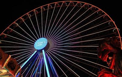 Keywords: fair hustle and bustle year market folk festival ferris wheel carnies fairground pleasure fun leisure evening entertainment abendstimmung night perspective dark colorful color carousel ride romantic joy gondolas romance light attraction lights lighting darkness