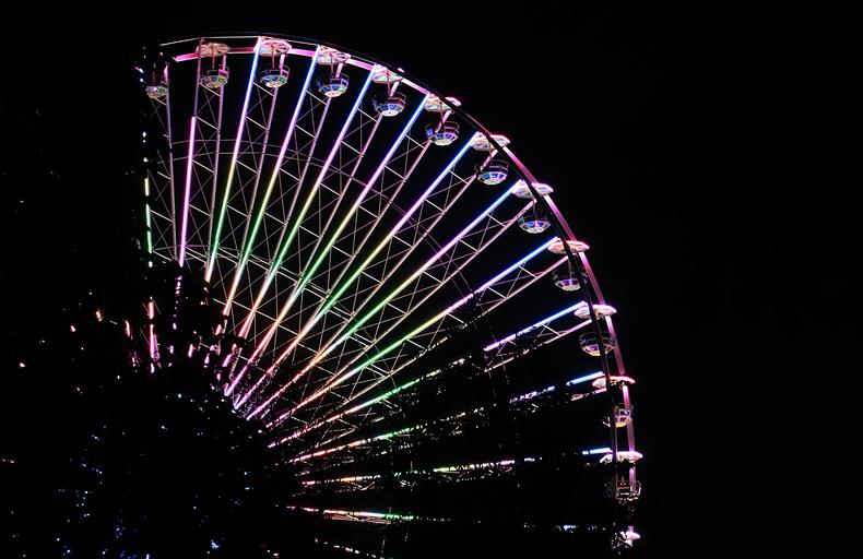 Keywords: fair hustle and bustle year market folk festival ferris wheel carnies fairground pleasure fun leisure evening entertainment abendstimmung night perspective dark colorful color carousel ride romantic joy gondolas romance light attraction lights lighting darkness