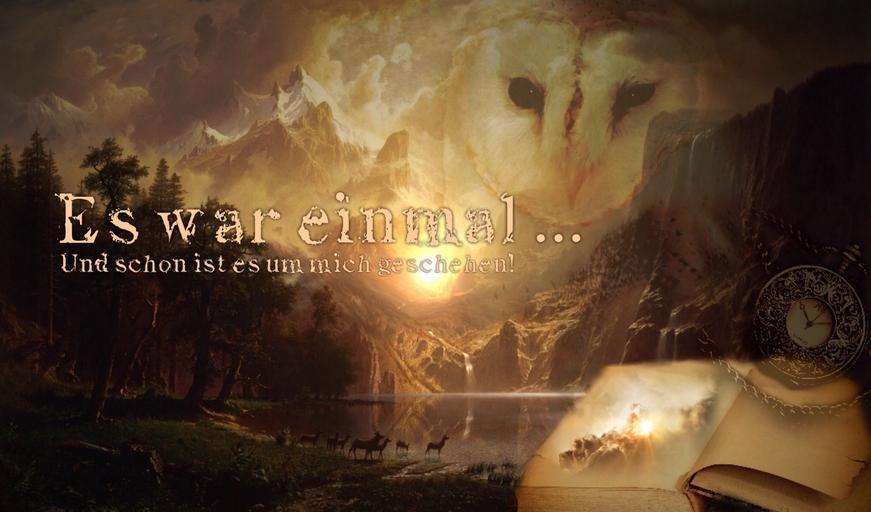 Keywords: fairy tales book mythical creatures middle ages mystical atmosphere mountain sky dream world view dreams storybook horse forest romantic books owl pocket watch nature discoloration sunlight clouds sun lichtblick mood fairytale shadow play leaves trees landscape