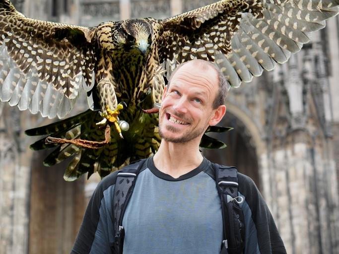 Keywords: falcon attack approach human prey funny laugh making a face mischief