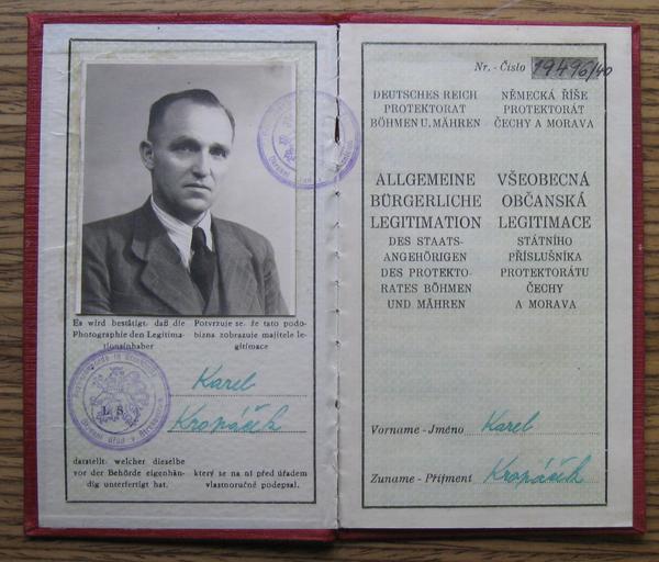 | Keywords: Falesna.Legit.Karel.Prokop.Alias.Karel.Kropacek.jpg cs Karel Prokop 1893 - 1943 - za první světové války příslušník československých legií v Rusku; za protektorátu přednosta a inspektor Finančního úřadu potravní daně a zároveň vedoucí odbojové skupiny v Praze Jinonicích jakož i zástupce velitele ilegální skupiny Vašek-Čeněk Po zátahu gestapa na jinonický akcíz 4 října 1941 přešel do ilegality a ukrýval se na plzeňsku kde používal falešné doklady na jméno Karel Kropáček Zatčen gestapem 4 července 1942 v Plzni - Skvrňanech Popraven dne 8 září 1943 ve věznici v Berlíně-Plötzensee en Karel Prokop 1893 - 1943 During the First World War he was a member of the Czechoslovak legions in Russia During the protectorate he was a chief inspector of the Tax Office and excise taxes and he was also leader of resistance group in Prague Jinonice and also he was a deputy commander of an illegal group Vašek-Čeněk After the gestapo made an attack on the Jinonice excise duty office 4 October 1941 he went underground and he hid himself in around Pilsen where he used false documents in the name of Karel Kropáček Arrested by the Gestapo July 4 1942 in Pilsen - Skvrňany Executed to death on September 8 1943 in the prison in Berlin-Plötzensee 2013-01-15 11 50 28 CZ Volně přístupné archivy České republiky <br/> EN Freely accessible archives of the Czech Republic CZ Autorem této fotografie je neznámá osoba <br/> EN Author of this photo is unknown person other versions Custom license marker 2016 04 21 anonymous-EU/cs PD-old PD-CzechGov Heroes Protectorate of Bohemia and Moravia Karel Prokop |