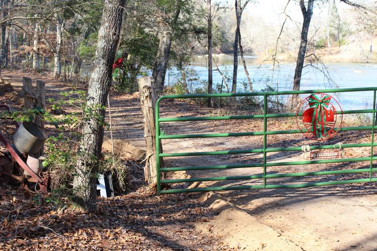 Keywords: fall autumn river nature trail gate wood outdoor serene tranquil farm