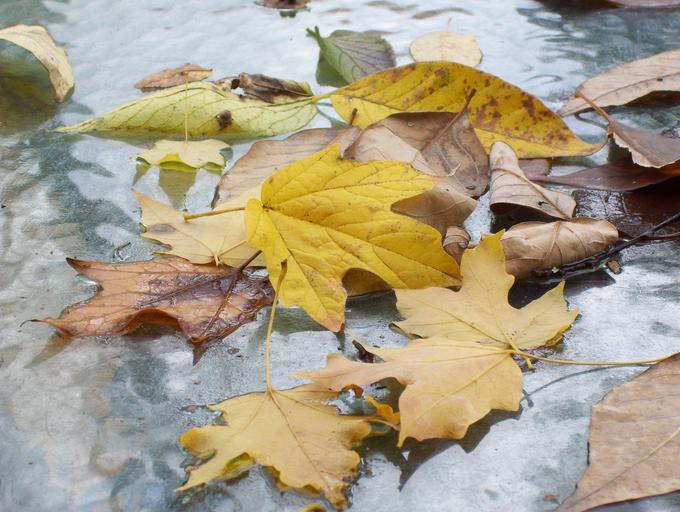 Keywords: fall leaves autumn autumnal brown covered table table textured nature