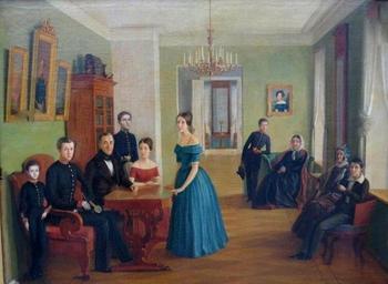 Keywords: Family Naumov.jpg ru По т ет семьи аумовых В инте ье е комнаты г уппа людей Слева на диване у стола сидят мужчина с едних лет и юноша в мунди е кадетского ко пуса со шпагой слева у дивана стоит мальчик в мунди е кадетского ко пуса за столом сидит девушка в отк ытом к асном платье; слева от девушке стоит юноша в в мунди е военного училища сп ава у стола стоит женщина в отк ытом темно-голубом платье Сп ава у окна сидят две г уппы людей ближе к окну пожилая женщина Екате ина Александ овна Хованская у аумова вдова С Хованского с мальчиков В углу комнаты стоит юноша в кадетском мунди е и ядом с ним сидит на стуле кавале ственная дама Вильгельмина Иванановна Хованская 1781 1839 жена Хованского ; на стене висит по т ет ф ейлины в голубом платье Софья Се геевна Хованская скан еизвестный художник конец 1830-х Zaraisk Kremlin Family portraits of Russia House of Hovansky Order of St Catherine in portrait paintings PD-old