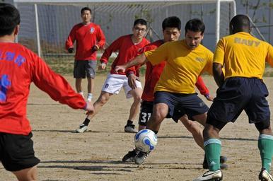 | Keywords: Fancy footwork in Korea DVIDS156278.jpg en Petty Officer 1st Class Andre Dortrait assigned to the amphibious command ship USS Blue Ridge maneuvers between Republic of Korea Navy soccer team members during a soccer game Blue Ridge and embarked U S 7th Fleet staff basketball and soccer teams played against Republic of Korea navy teams during a port visit in Busan 2009-03-08 https //www dvidshub net/image/156278 090308-N-+++++-066 2009-03-10 05 46 BUSAN KR PD-USGov-Military-Navy USS Blue Ridge LCC-19 Images from DoD uploaded by Fæ |