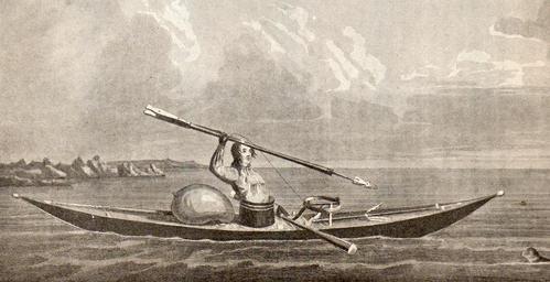 Keywords: Fangerkajak.jpg Da Grønlandsk fangerkajak omkring 1830 Før og Nu Historisk topografisk tidsskrift og illustrationsværk 1919 redigeret af F Zachariae 1919 Stik af H G F Holm og J Holm hans far efter tegning af W A Graah på hans Undersøgelsesrejse til Grønland i Aarene 1828 - 31 PD-old H G F Holm History of Greenland Inuit kayaking |