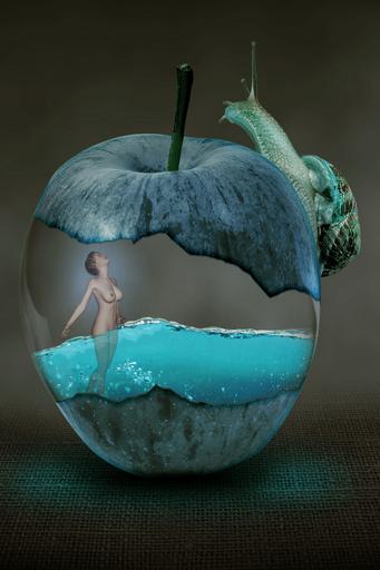 Keywords: fantasy surreal apple snail slug water magic mystery fairytale fruit imagination tale dreamy woman naked woman girl