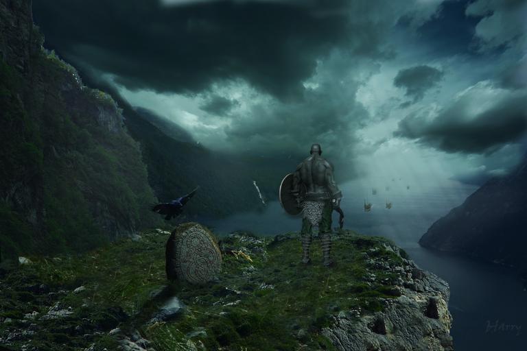 Keywords: fantasy water grey sky mood photo montage digital art mysticism atmosphere landscape nature human mountain rock fog of course