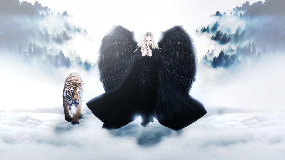 Keywords: fantasy woman cat tiger magic girl female fantasy girl fantasy woman people snow trees mountain black white angel devil
