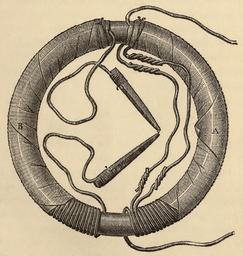 | Keywords: Faradays transformer.png  Drawing of the first transformer built by British scientist Michael Faraday in the 1830s It consisted of an iron ring with two windings of insulated wire around it Faraday attached one winding to a sensitive galvanometer When he touched the other winding to a single cell battery the winding created a changing magnetic field in the ring which induced a momentary current in the second winding due to electromagnetic induction which was registered by the galvanometer <br><br> Although this device looks remarkably like a modern transformer Faraday is not considered the inventor of the transformer He only applied individual pulses of current to his device not the alternating current that allows modern transformers to work continuously More importantly the device had the same number of turns on both windings Faraday did not discover the principle that makes transformers useful - that it can be used to transform the voltage up or down by using different numbers of turns in the seconday than in the primary winding Downloaded 2009-08-06 from Frederick Bedell 1868-1958 1896 http //books google com/books id 4SwJAQAAIAAJ pg PA288 The Principles of the Transformer The MacMillan Co New York p 288 fig 162 <br> High resolution version from Friedrich Uppenborn 1859-1907 1889 http //www archive org/details/historyoftransfo00upperich History of the Transformer p 3 fig 2 1896 Author Public domain - published at least 114 years ago PD-old Historic transformers Michael Faraday |
