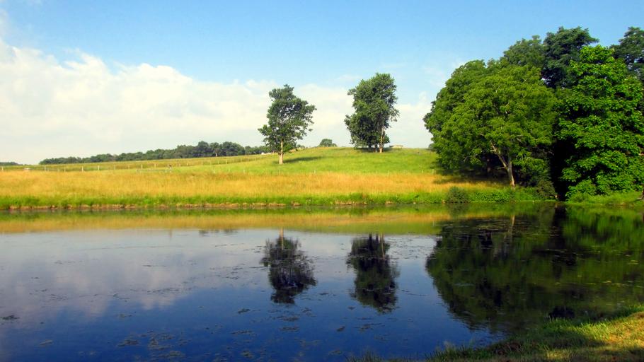 Keywords: farm pond summer sky water tree grass country meadow rural reflection green outdoor nature view land peaceful field